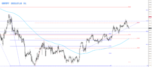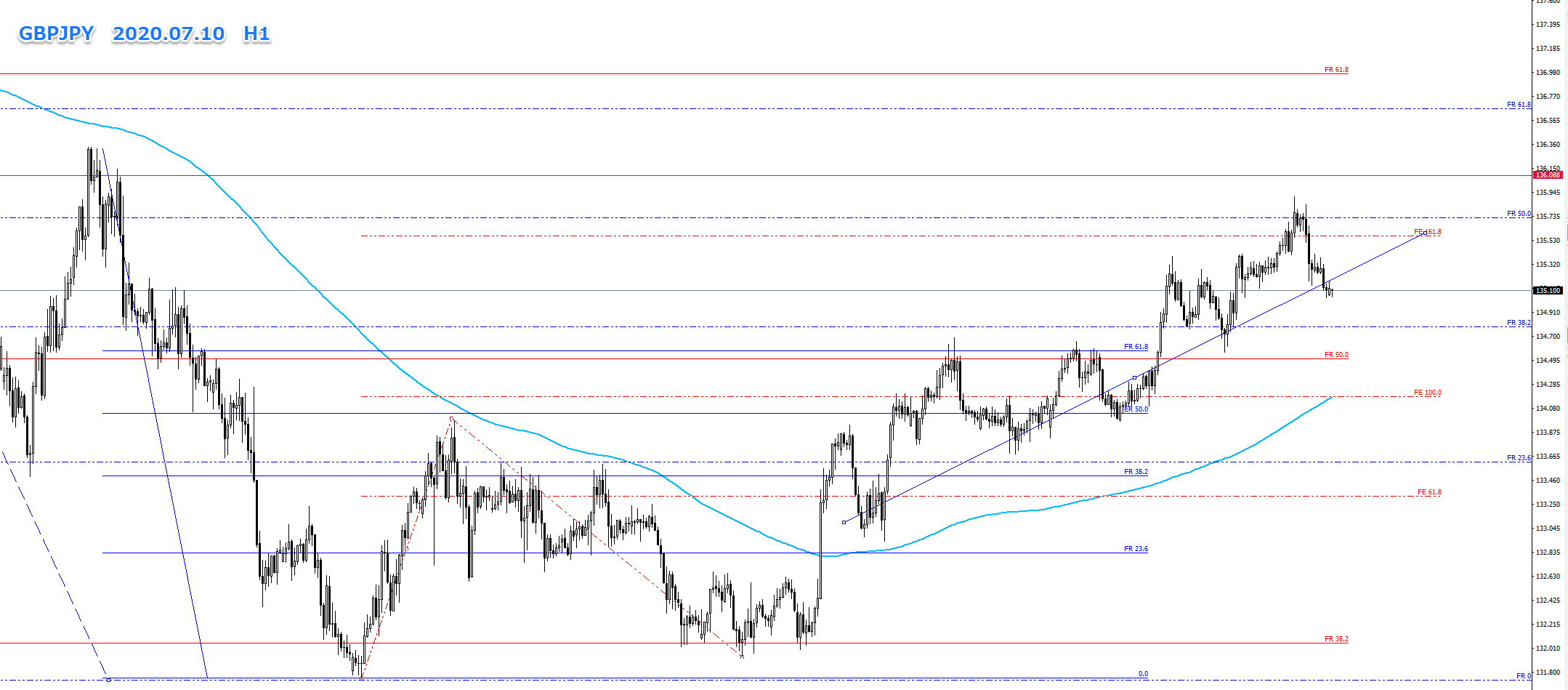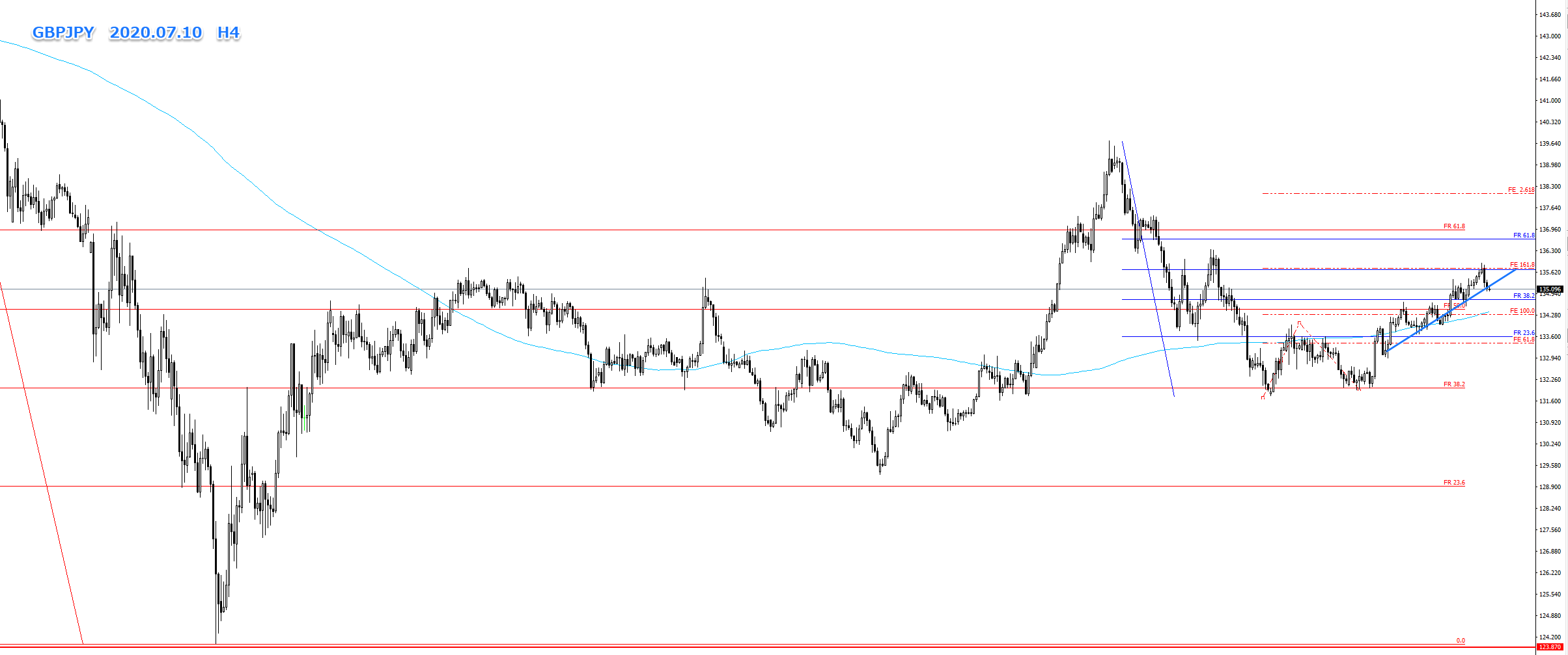 FX環境認識 【GBPJPY】 2020.07.10 エントリーポイント X Facebook はてブ Pocket LINE コピー 2020.07.102020.07.20 4時間足上昇トレンド 週末の上昇は? 4時間足レベルでの上昇5波と捉えると、上昇の余地はまだまだありますが、昨日は、FE161.8と親波FR50まで上昇後、下降に転じました。 トレンドラインを割っていくようであれば、上昇の小休止も考えられると思います。 昨日からの上昇FR61.8まで80pips程を戻してきました。 4時間足レベルでの上昇スイングのFE161.8付近での戻りでもあるため、上昇の余地はあるものの、警戒が必要かもしれません。