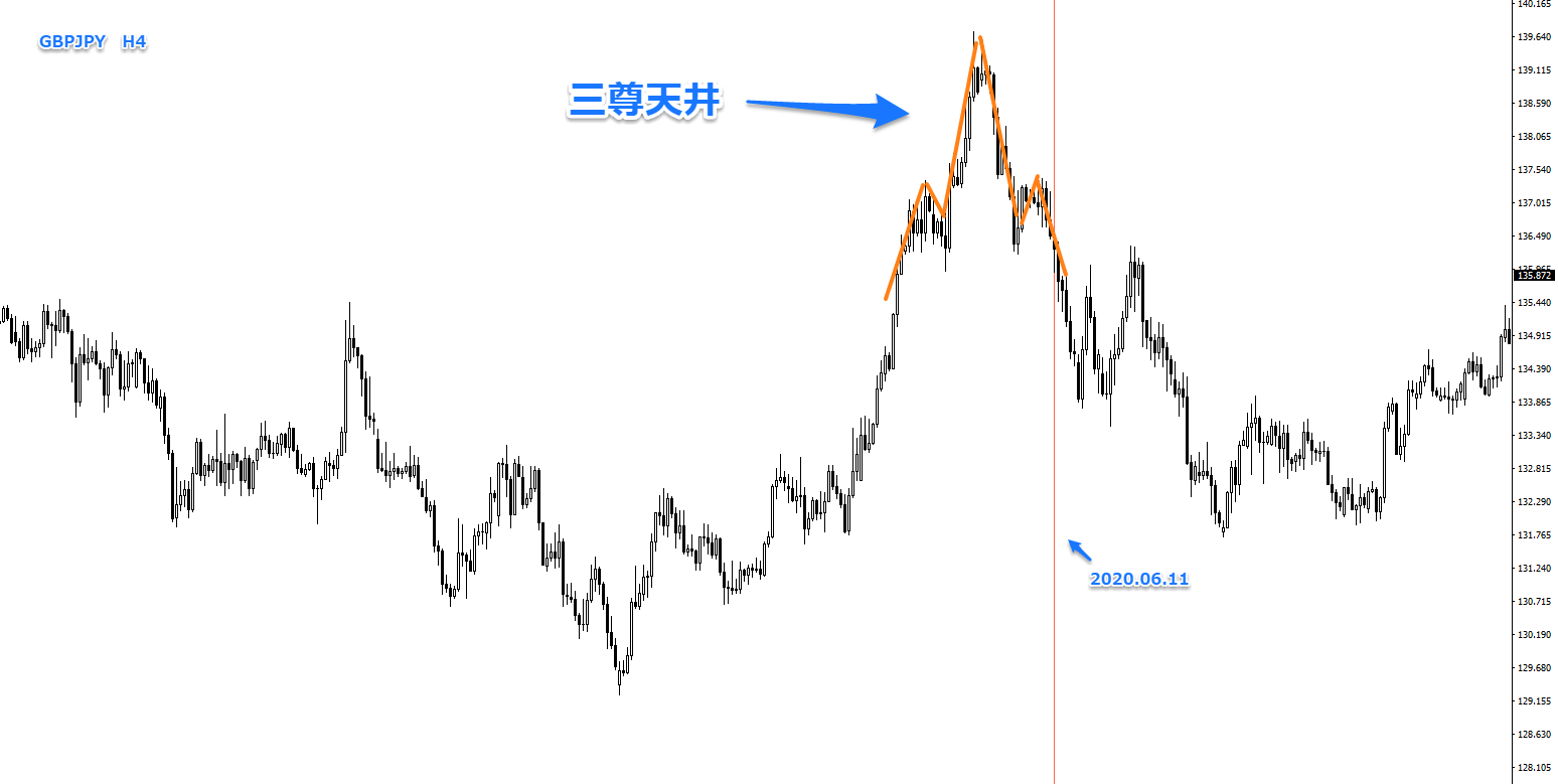 下のチャートは、ポンド円の4時間足です。大きな山が三尊天井を形成して下降しています。実際のトレードでは、そのほかの分析ツールも使ったうえで実際のエントリーを行いますが、今回は三尊天井に焦点を絞って解説します。