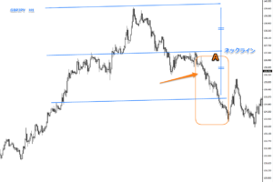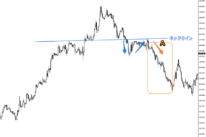 実は、ヘッドアンドショルダーだけの根拠では、利益を狙っていくのは、ネックラインからの戻りのAとなります。
