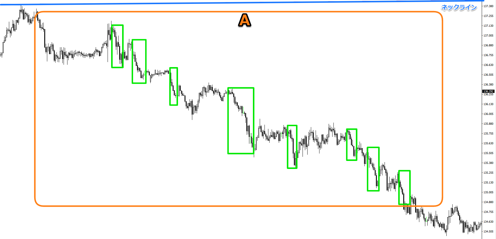 ネックランを越えずに下降を確認したら、Aの中でエントリーする。
