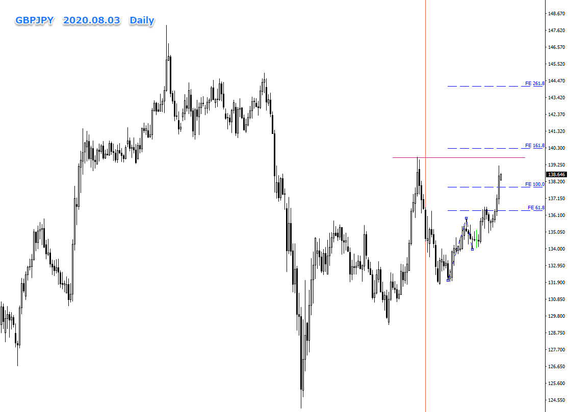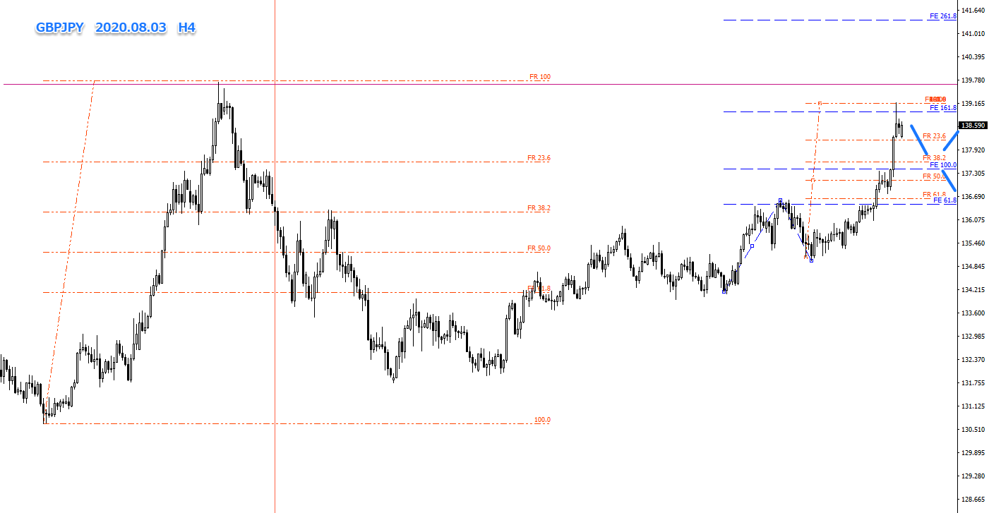 3波高値付近まで少し余力がありますし、FE161.8までの上昇も可能性としてありかとは思います。