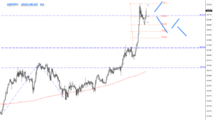 コロナ過の落ち込み124.098円付近(2020.03.17)=2016.10.07の底値から大きな波動で上昇。その上昇を1波と見るなら、現在はエリオット波動5波で上昇中と見られます。