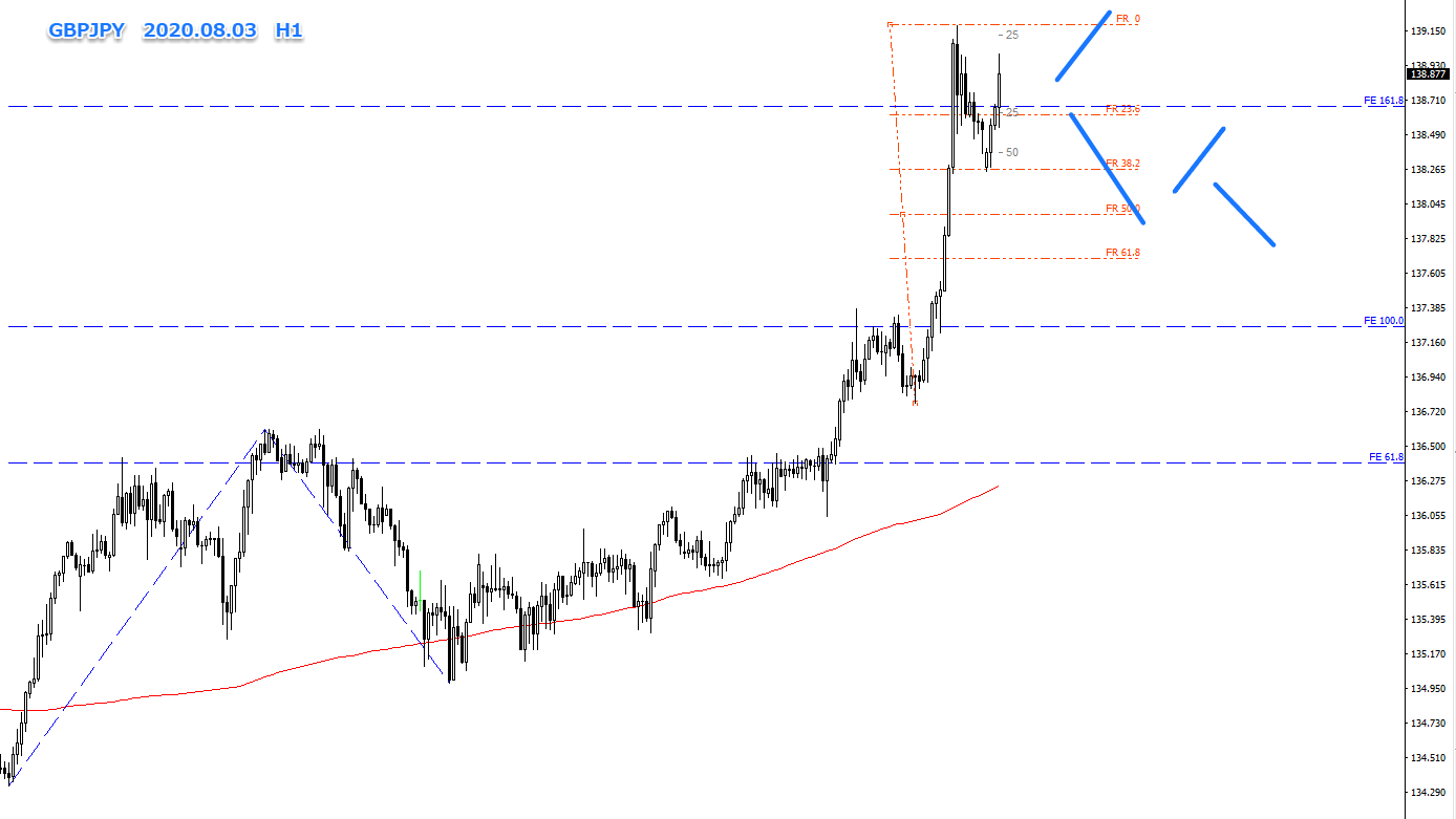 戻りも時間的に早く、上昇の勢いを感じます。前回高値まで上昇するのかもしれません。さらに、FE261.8付近までもあるのかなとも思わせる勢いです。