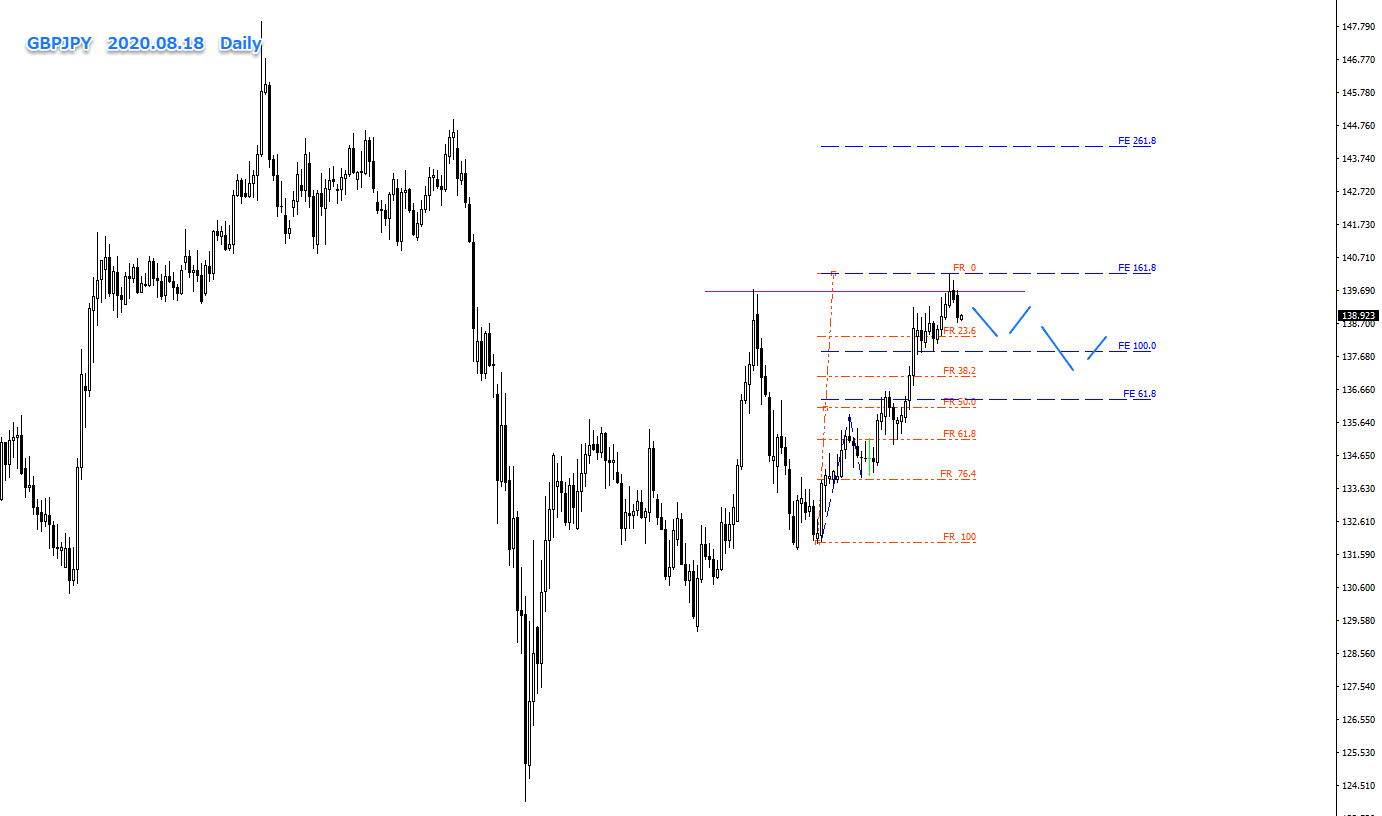 とすると、今後親波のFR50付近まで(136円付近)の下降もありうるのかと思われますが、当面の目標は、FR23.6までの下降と、FR38.2までの下降となると思います。