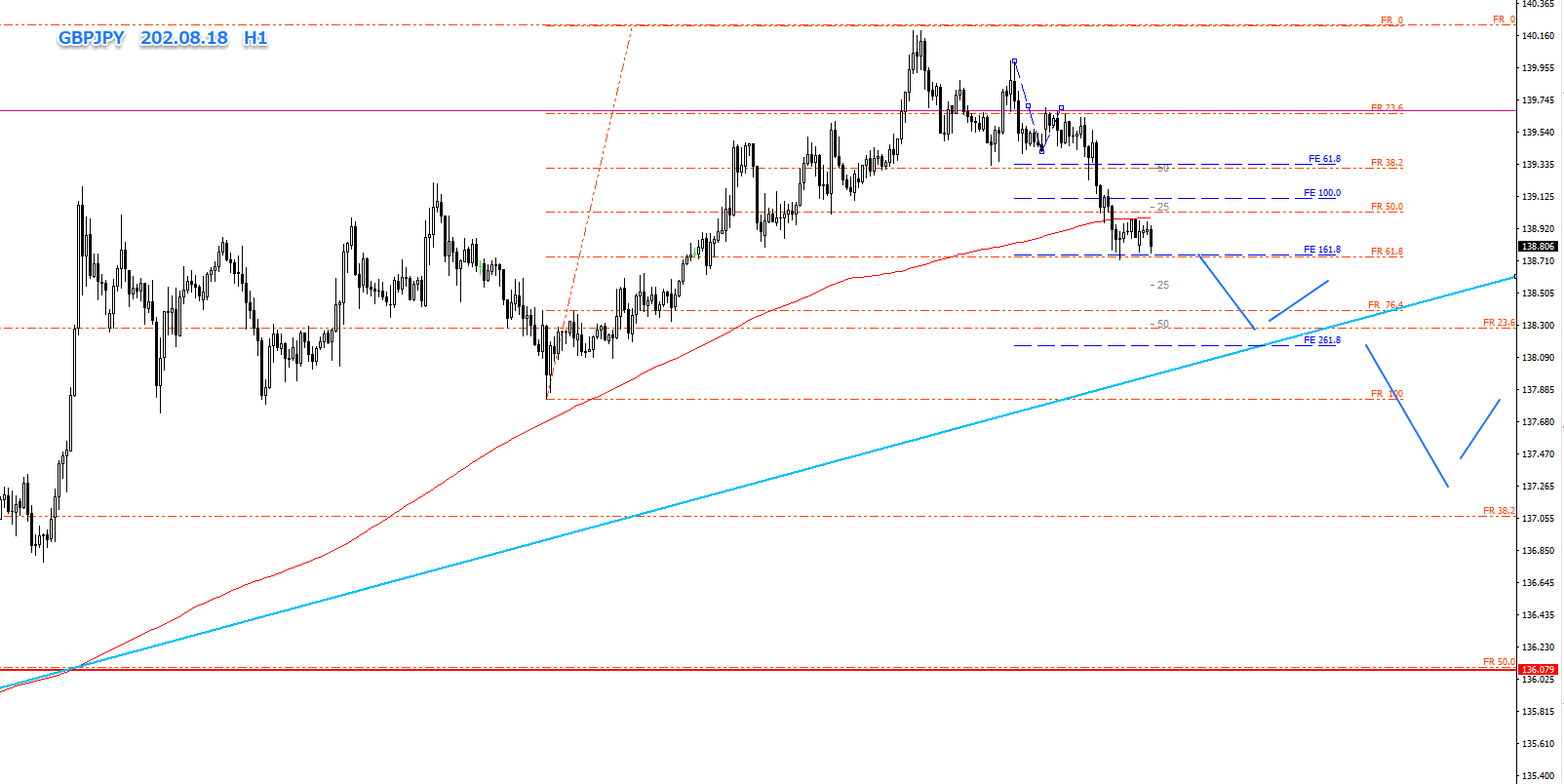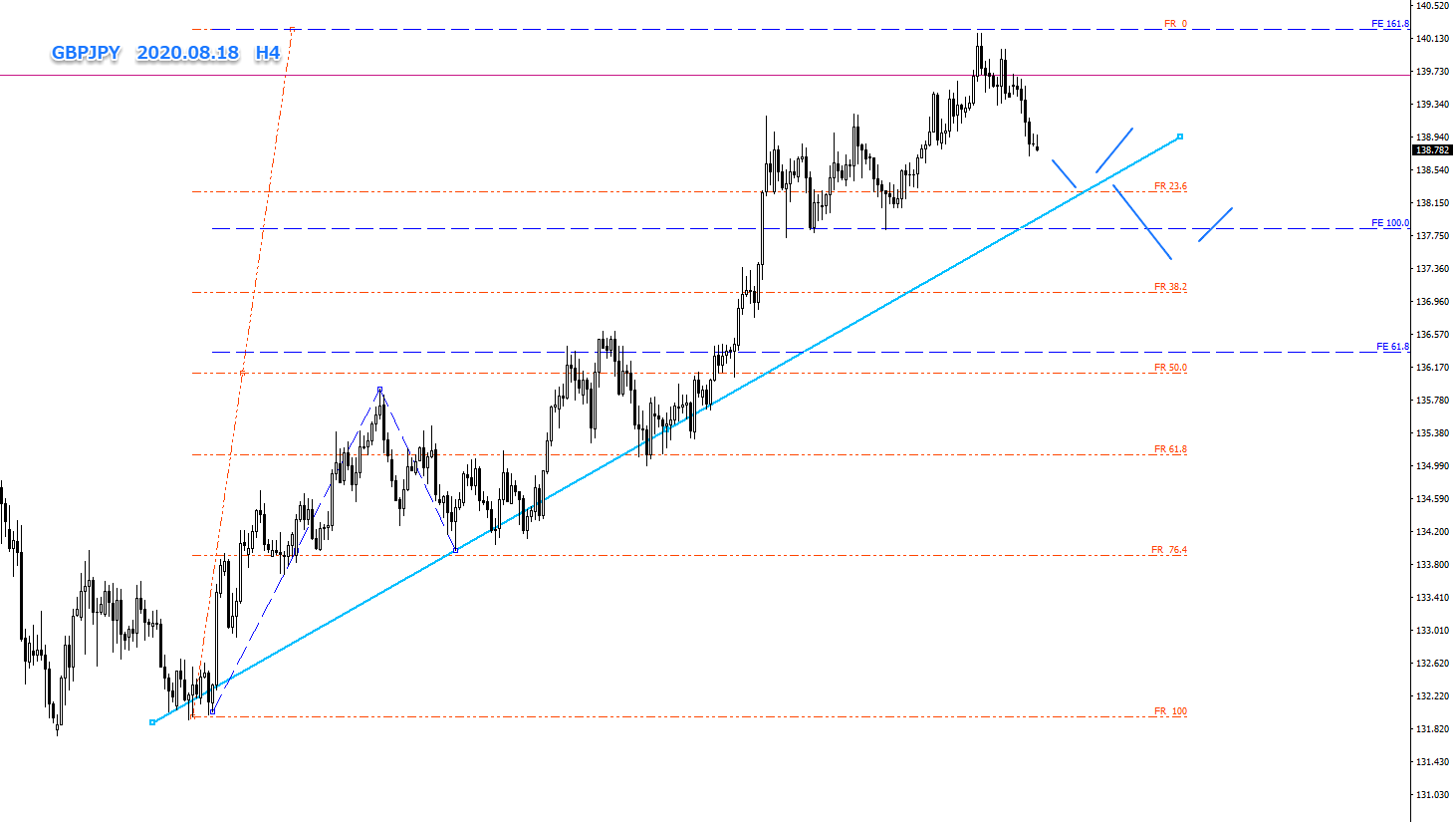 時間足でのFE161.8で下げ止まっていますが、戻りは大きくありません。上位足での親波FR23.6までの下降と、更に親波のFR38.2までの下降を意識した、ショート狙いでシナリオを立てたいと思います。