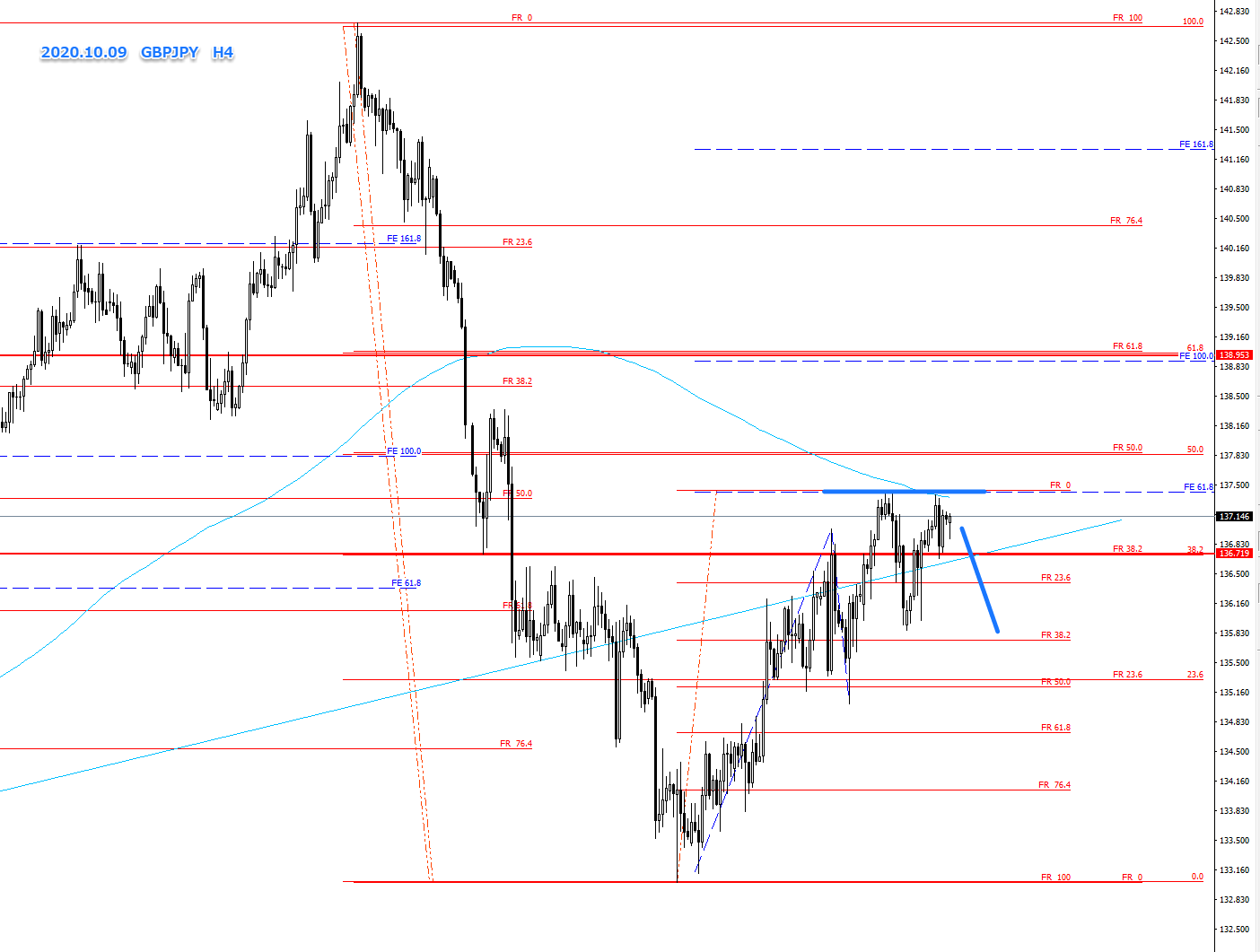 先週の抵抗線となっていた下降親波のFR38.2(136.710円付近)を越えてきましたが、4時間足レベルのFE61.8(137.400円付近)で戻りが入りました。