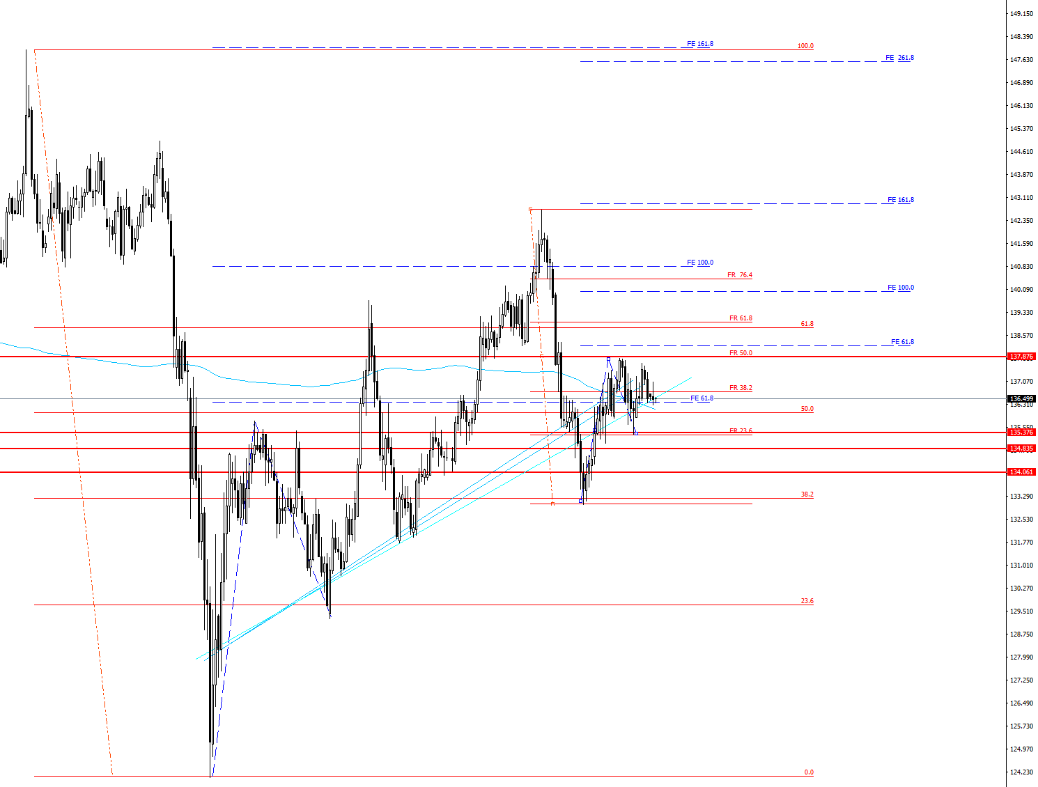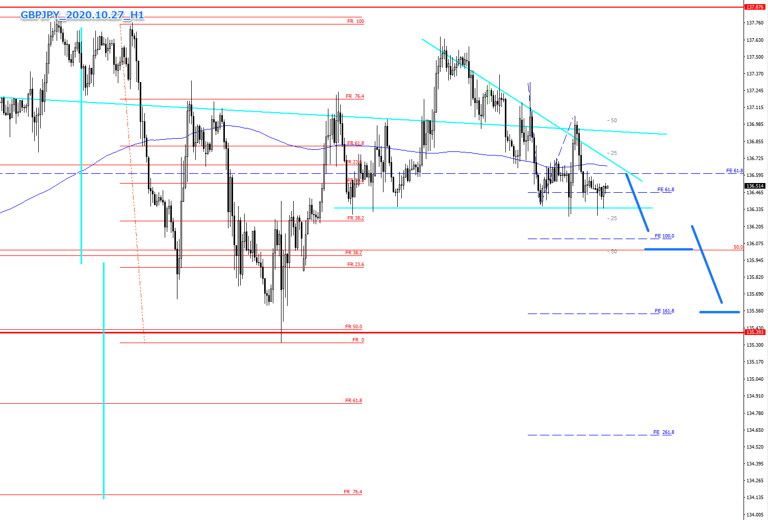 1時間足レベルでの下降は、FE100.0、FR50.0(136.00円付近)までが、第一目標、次は、FE161.8、FR50.0(135.400円付近)が目標かと思います。