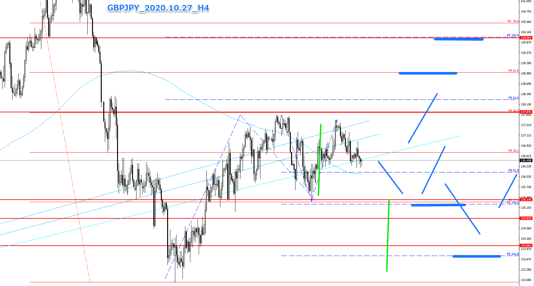 ダブルヘッド的な形を形成しつつありますので、いったん下降するのか、またはこのまま上昇し、FR61.8(138.962円付近)かFE100.0(139.991円付近)を目標値とするのかまだわかりません。
