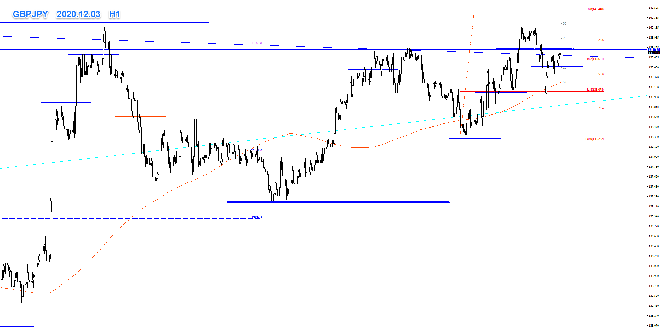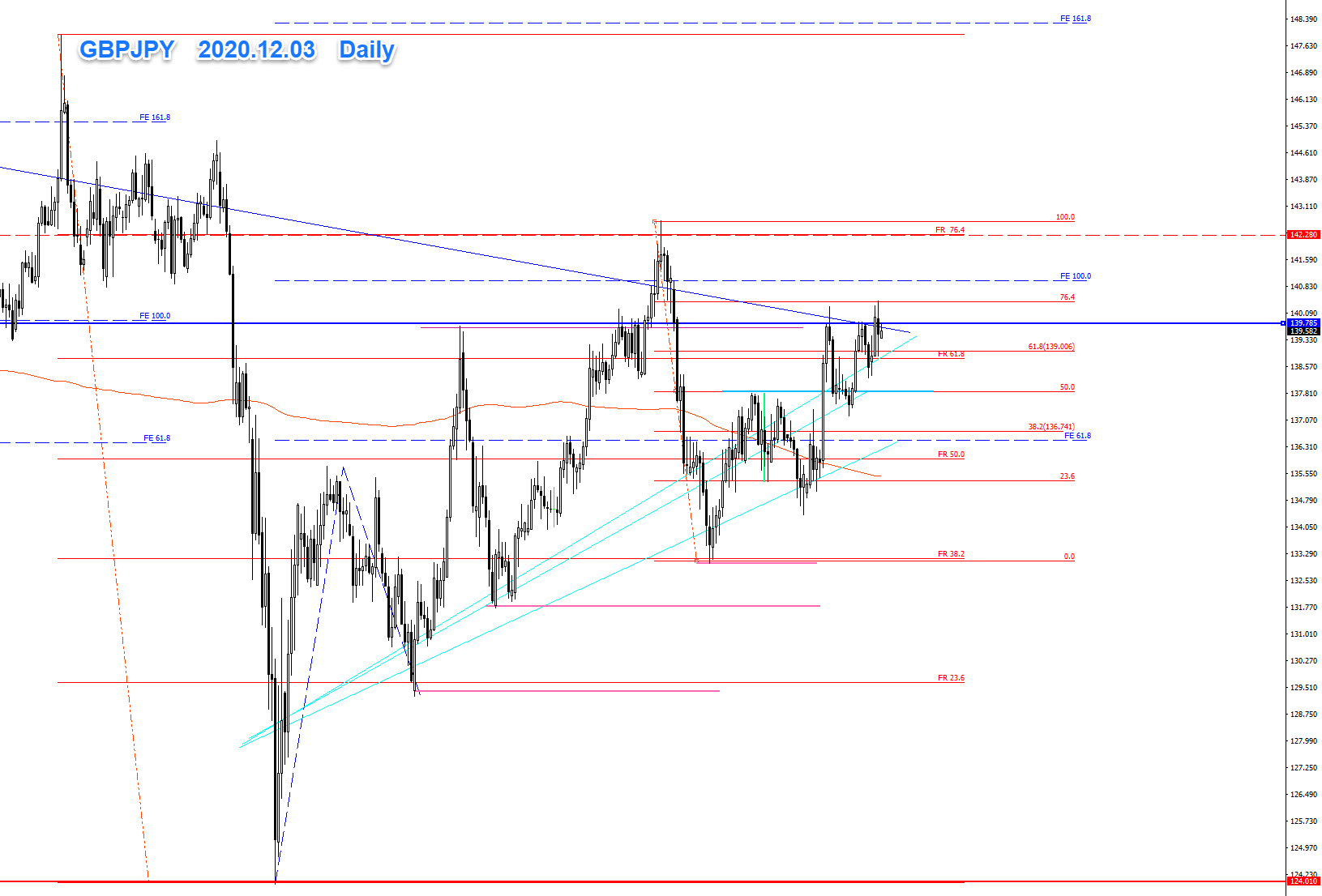 現在は、5波後の直近高値からの下降、その後の上昇波中です。200~300pips程の下降を入れながらも、上昇を続け直近高値のFR76.4(140.380円付近)にタッチしています。