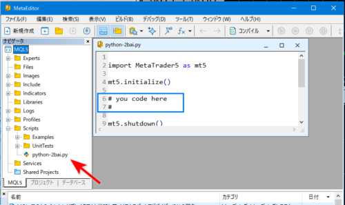 これまでは、PythonからMT5に入っていたのね。今度は、MT5のMEでPythonを動かすわけね。