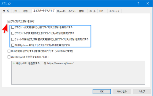 3. 「アルゴリズム取引を許可する」にチェックを入れ、その下の4つには✓がないことを確認して「OK」をクリックします。