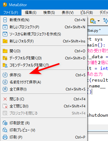 こんなに簡単に、MetaEditorでPythonプログラムを使うことができるのね。