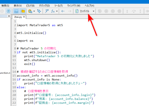 MetaTrader5上でPythonプログラムを実行してみます。実行したいpyファイルを選び、MetaEditorのコンパイルをクリックします。