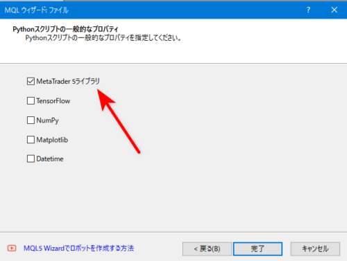 必要なライブラリのインストールを選びます。今回は、MetaTrader5だけで大丈夫。